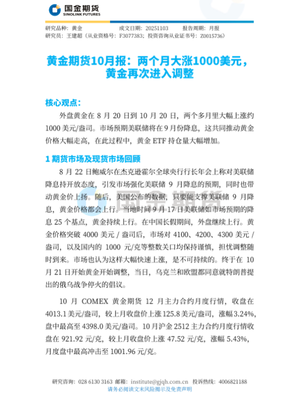 【国金期货】【202511】黄金期货10月报:两个月大涨1000美元,黄金再次进入调整-5页 证券期货研究报告