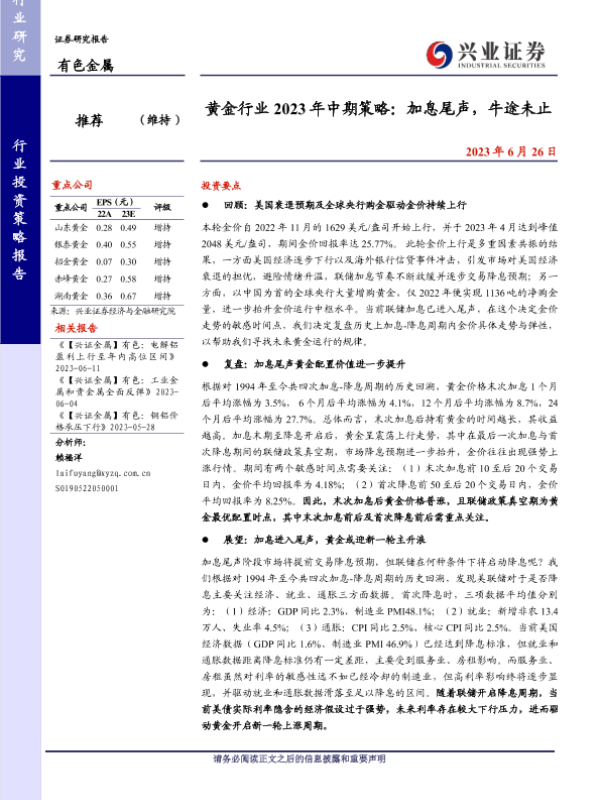 【兴业证券】【20230626】黄金行业2023年中期策略:加息尾声,牛途未止-32页 行业研究