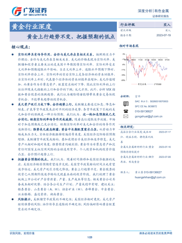 【广发证券】【20230719】20230719-广发证券-黄金行业深度:黄金上行趋势不变,把握预期的低点-23页 行业研究
