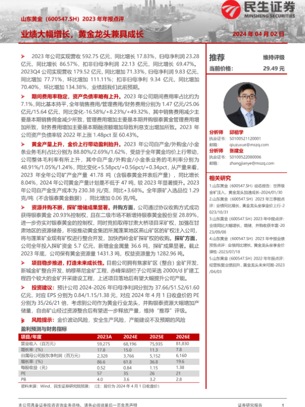 【民生证券】【20240402】山东黄金-600547.SH-2023年年报点评:业绩大幅增长,黄金龙头兼具成长-14页 行业研究