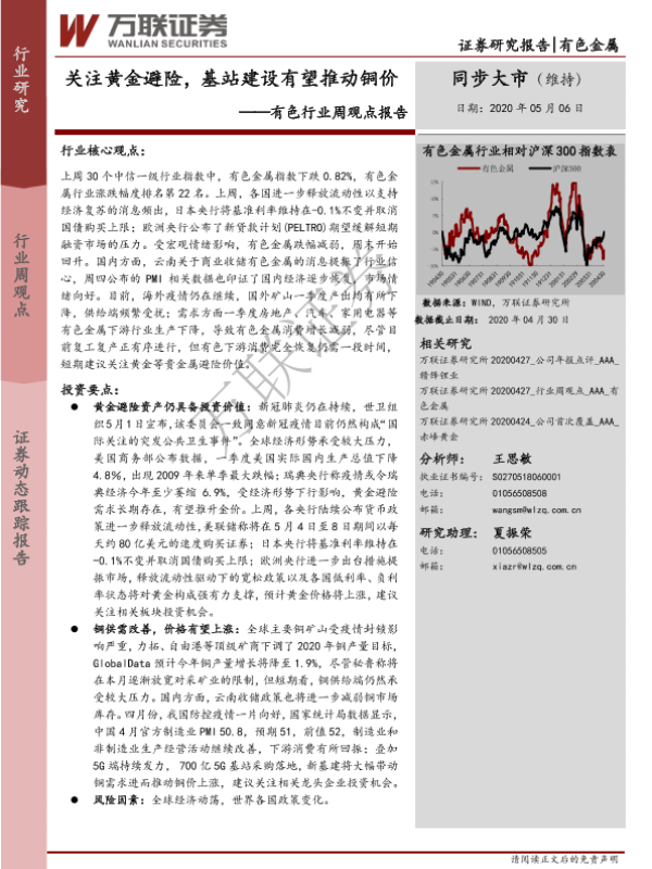 【万联证券】【20200506】20200506-万联证券-有色行业周观点报告:关注黄金避险,基站建设有望推动铜价-14页 行业研究