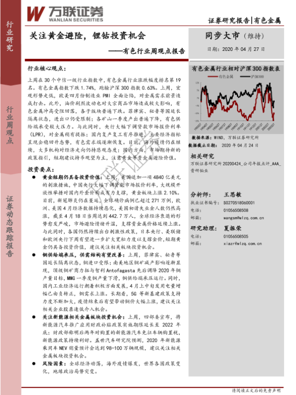【万联证券】【20200427】20200427-万联证券-有色行业周观点报告:关注黄金避险,锂钴投资机会-14页 行业研究