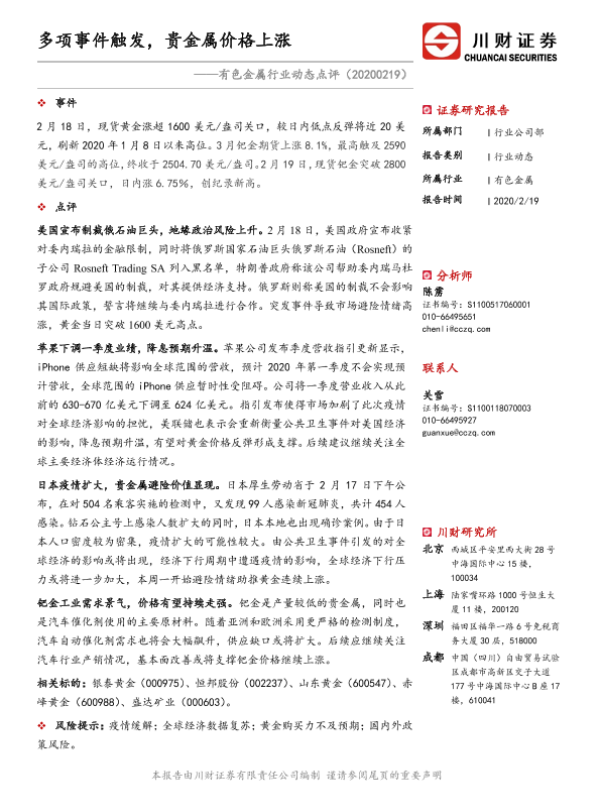 【川财证券】【20200219】有色金属行业动态点评:多项事件触发,贵金属价格上涨-2页 证券期货研究报告