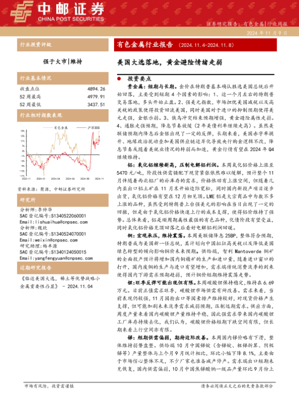 【中邮证券】【20241109】20241109-中邮证券-有色金属行业报告:美国大选落地,黄金避险情绪走弱-13页 行业研究