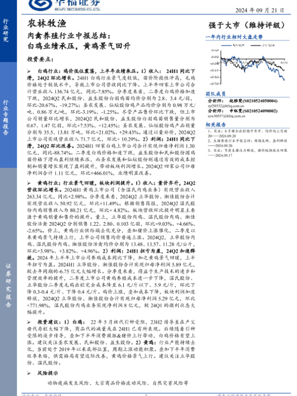 【华福证券】【20240921】肉禽养殖行业中报总结:白鸡业绩承压,黄鸡景气回升-13页 行业研究