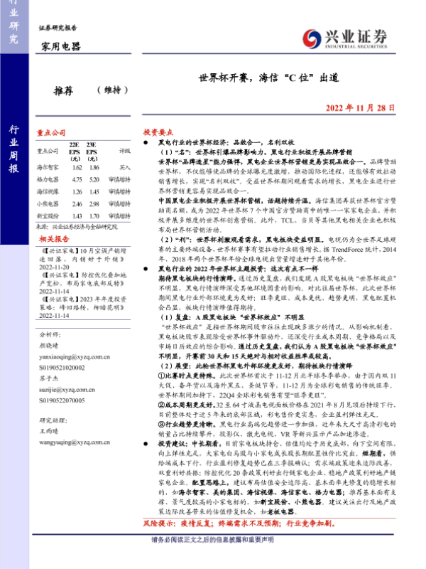 【兴业证券】【20221128】20221128-兴业证券-家用电器行业周报:世界杯开赛,海信“C位”出道-13页 行业研究