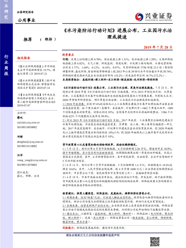 【兴业证券】【20190728】《水污染防治行动计划》进展公布,工业园污水治理或提速-10页 行业研究