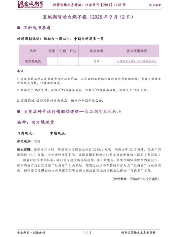 【宝城期货】【202509】宝城期货动力煤早报(2025年 9月 12日)-2页 证券期货研究报告