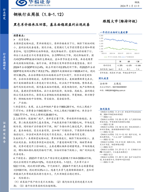 【华福证券】【20240113】20240113-华福证券-钢铁行业周报:黑色系价格承压回落,基本面稳固盈利出现改善-16页 行业研究
