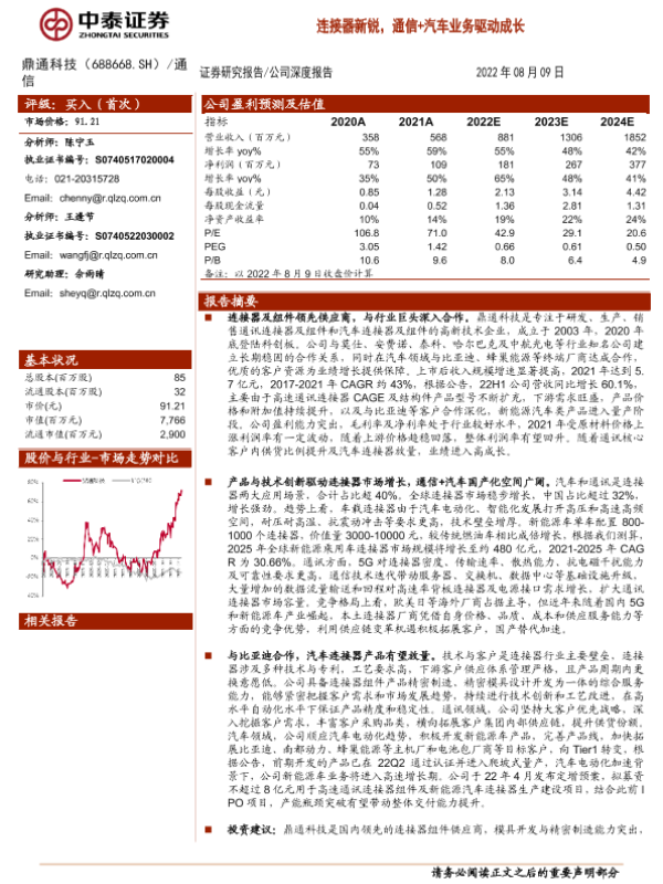 【中泰证券】【20220809】20220809-中泰证券-鼎通科技-688668.SH-连接器新锐,通信+汽车业务驱动成长-35页 行业研究