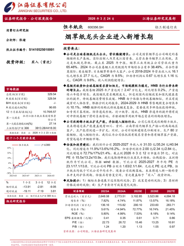 【江海证券】【202603】恒丰纸业 600356.SH 轻工制造行业 烟草纸龙头企业进入新增长期-23页 证券期货研究报告