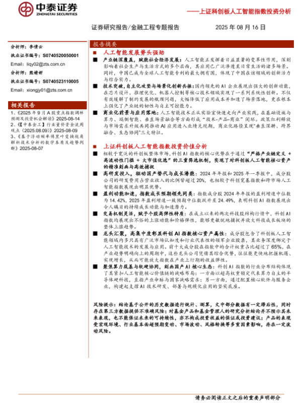【中泰证券】【202508】上证科创板人工智能指数投资分析:聚焦科技攻坚,重仓AI龙头-16页 证券期货研究报告
