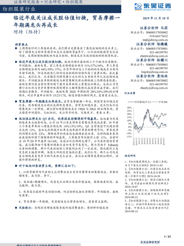 【东吴证券】【20191110】20191110-东吴证券-纺织服装行业:临近年底关注成长股估值切换,贸易摩擦一年期满龙头再成长-21页 行业研究
