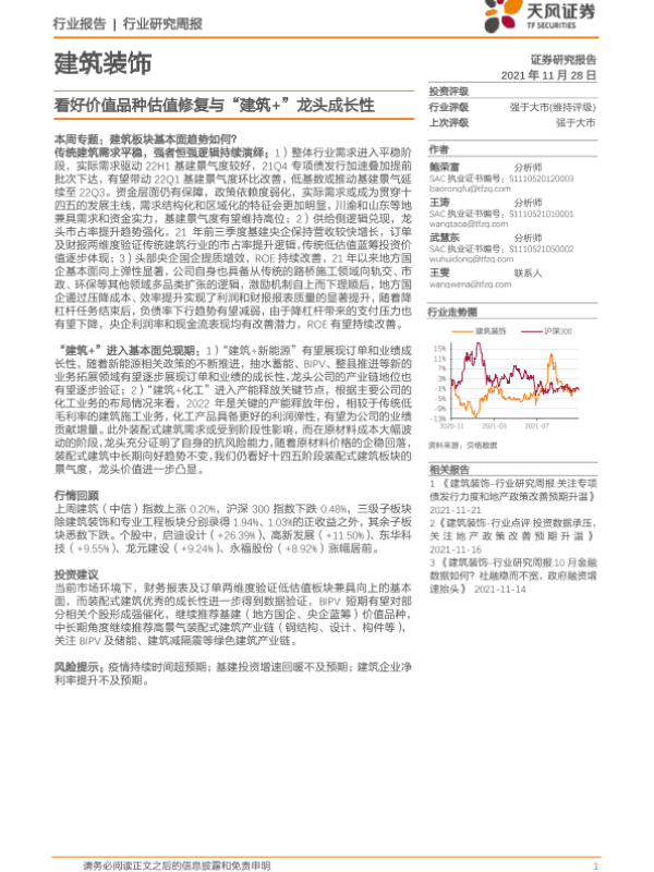 【天风证券】【20211128】建筑装饰行业研究周报:看好价值品种估值修复与“建筑+”龙头成长性-6页 行业研究