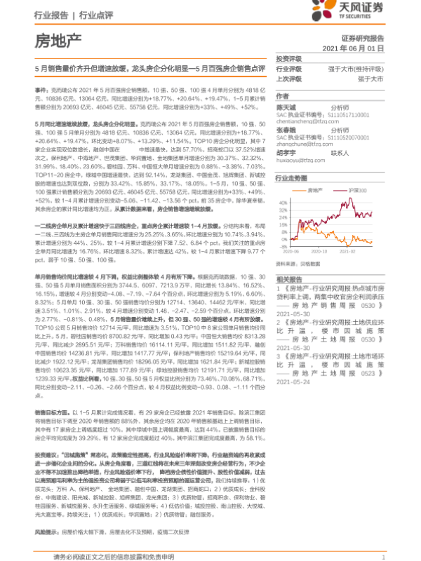 【天风证券】【20210601】5月百强房企销售点评:5月销售量价齐升但增速放缓,龙头房企分化明显-3页 行业研究