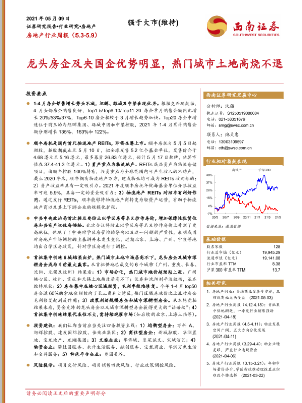 【西南证券】【20210509】房地产行业周报:龙头房企及央国企优势明显,热门城市土地高烧不退-15页 行业研究