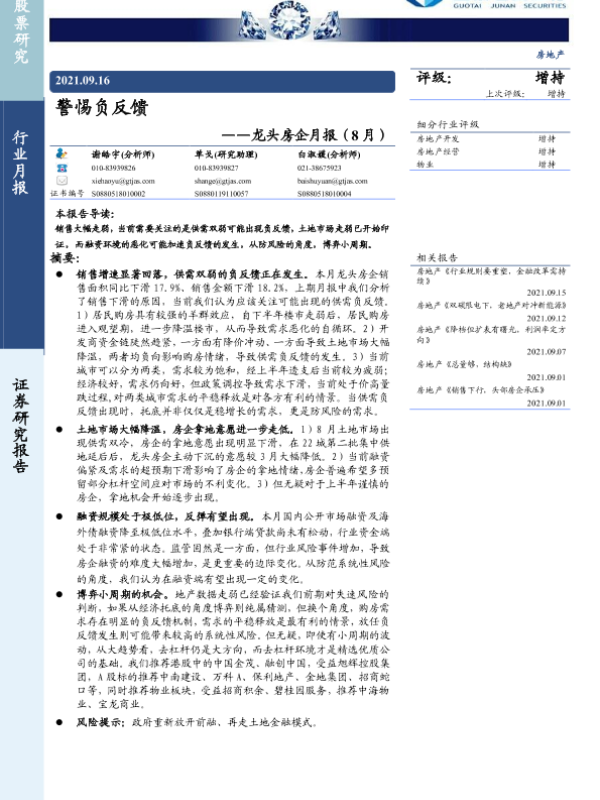 【国泰君安证券】【20210916】龙头房企月报(8月):警惕负反馈-12页 行业研究