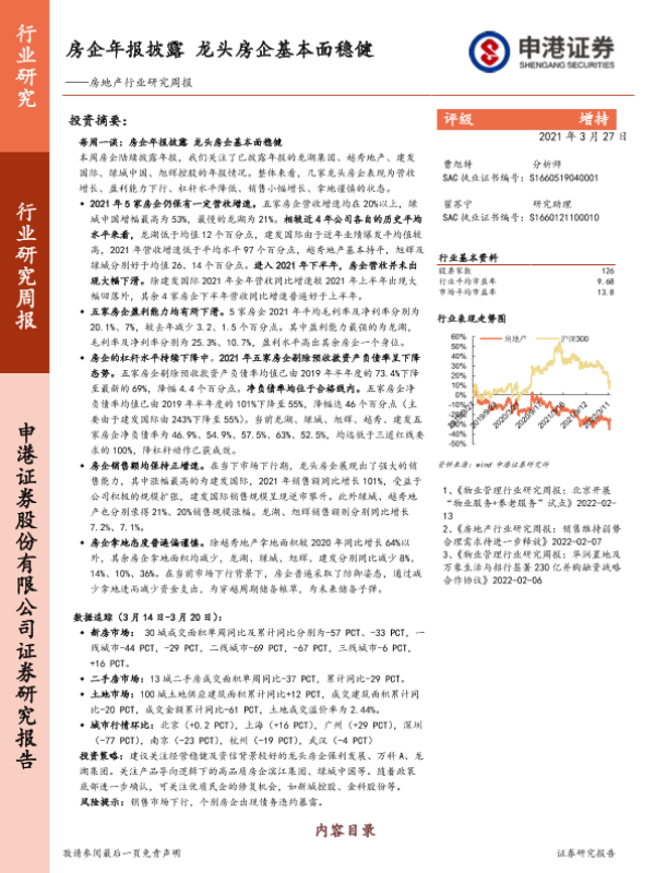 【申港证券】【20220327】房企年报披露 龙头房企基本面稳健-13页 行业研究