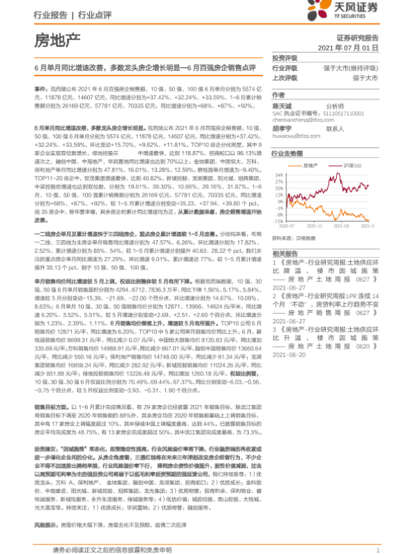 【天风证券】【20210701】6月单月同比增速改善,多数龙头房企增长明显——6月百强房企销售点评-3页 行业研究