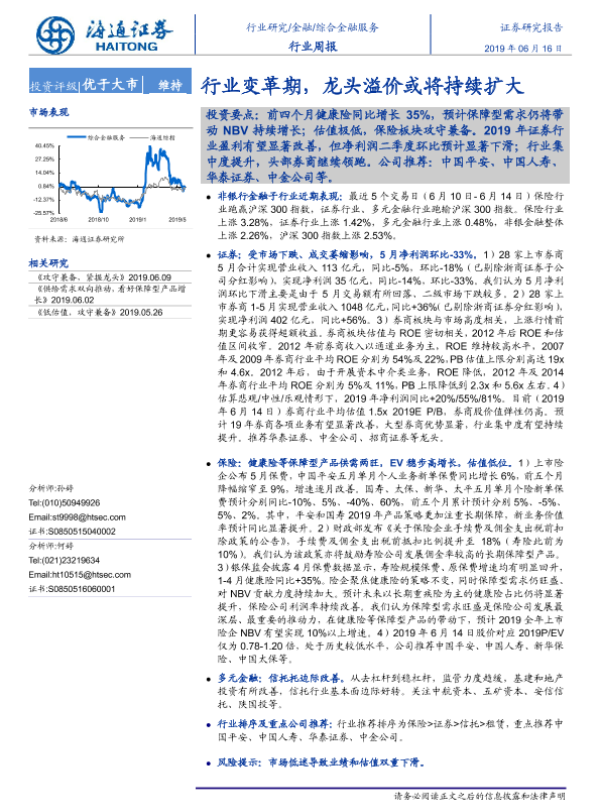 【海通证券】【20190616】综合金融服务行业周报:行业变革期,龙头溢价或将持续扩大-13页 行业研究