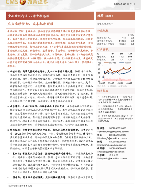 【海通证券】【202508】食品饮料行业25年中报总结:龙头业绩坚韧,成本红利延续-15页 证券期货研究报告