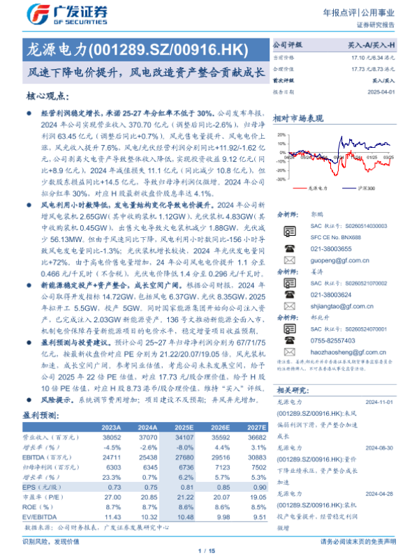 【广发证券】【20250401】龙源电力(001289)风速下降电价提升,风电改造资产整合贡献成长-15页 证券期货研究报告