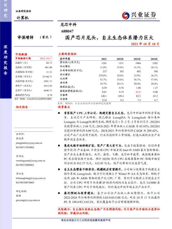 【兴业证券】【20221018】20221018-兴业证券-龙芯中科-688047.SH-国产芯片龙头,自主生态体系潜力巨大-30页 行业研究