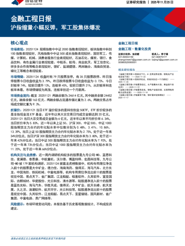 【国信证券】【202511】金融工程日报-沪指缩量小幅反弹,军工股集体爆发-15页 证券期货研究报告