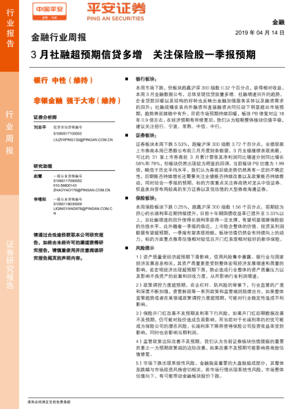 【平安证券】【20190414】3月社融超预期信贷多增 关注保险股一季报预期-10页 行业研究