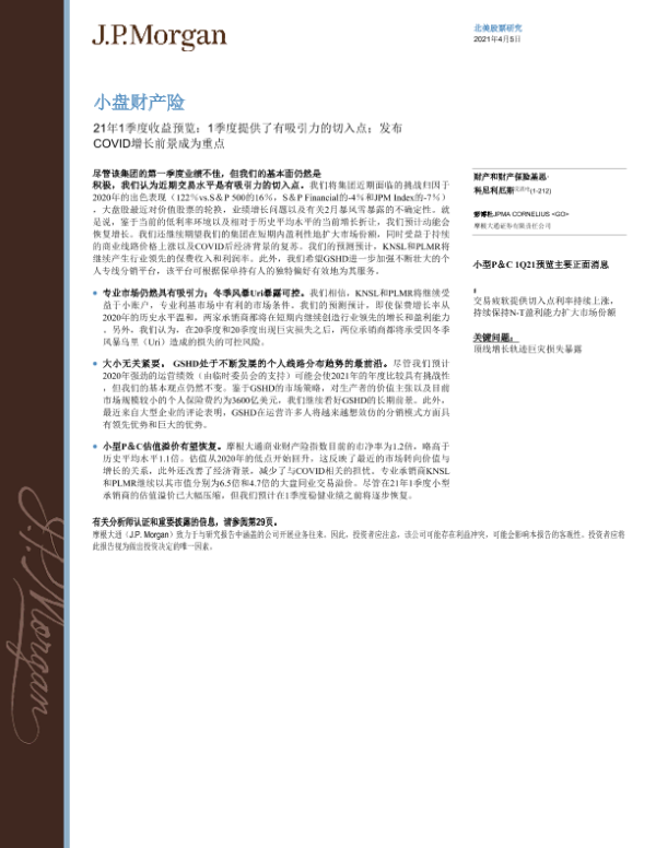 【J.P. Morgan】【20210405】2021年Q1小型财险公司业绩预览-34页 行业研究