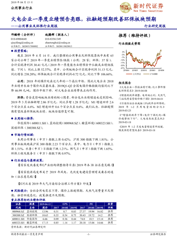 【新时代证券】【20190415】公用事业及环保行业周报:火电企业一季度业绩预告亮眼,社融超预期改善环保板块预期-13页 行业研究