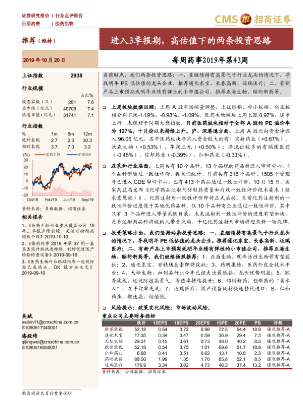 【海通证券】【20191020】每周药事2019年第43周:进入3季报期,高估值下的两条投资思路-3页 行业研究