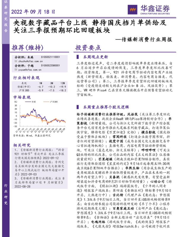 【华鑫证券】【20220918】传媒新消费行业周报:央视数字藏品平台上线 静待国庆档片单供给及关注三季报预期环比回暖板块-20页 行业研究