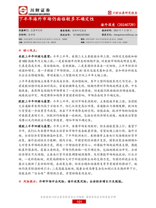 【川财证券】【20240729】海外深度:下半年海外市场仍面临较多不确定性-21页 行业研究