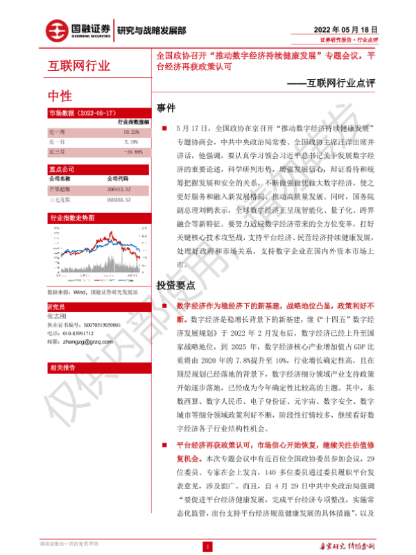 【国融证券】【20220518】互联网行业点评:全国政协召开“推动数字经济持续健康发展”专题会议,平台经济再获政策认可-3页 行业研究