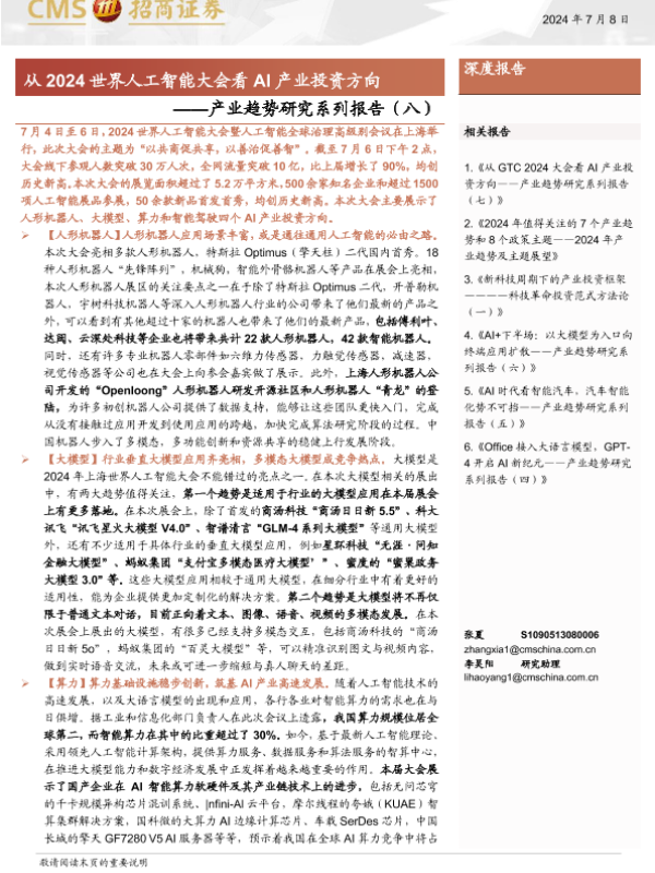 【海通证券】【20240708】产业趋势研究系列报告(八):从2024世界人工智能大会看AI产业投资方向-26页 行业研究