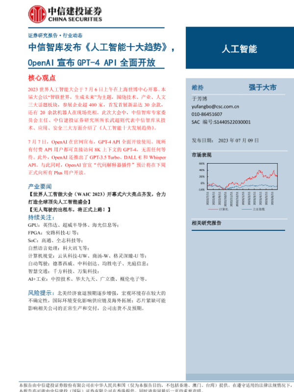 【中信建投证券】【20230709】人工智能行业:中信智库发布《人工智能十大趋势》,OpenAI宣布GPT-4 API全面开放-16页 行业研究