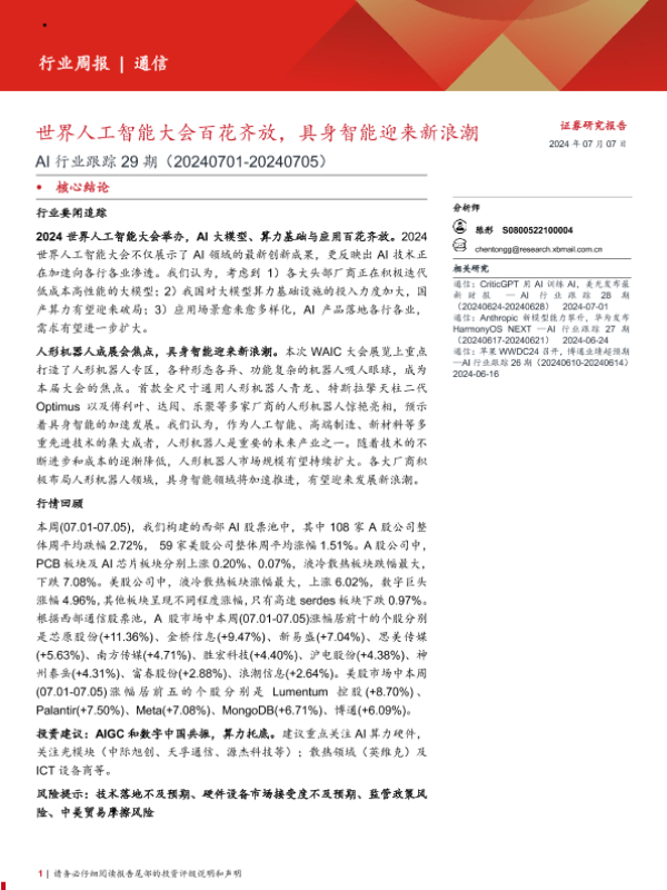 【西部证券】【20240707】AI行业跟踪29期:世界人工智能大会百花齐放,具身智能迎来新浪潮-13页 行业研究