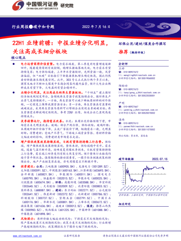 【银河证券】【20220716】20220716-中国银河-环保公用 建材 煤炭行业周报:22H1业绩前瞻:中报业绩分化明显,关注高成长细分板块-27页 行业研究