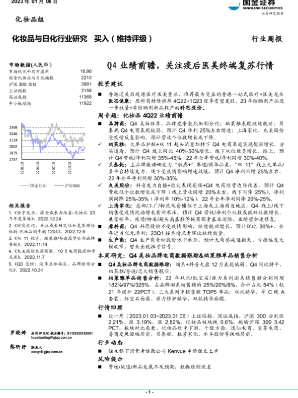 【国金证券】【20230108】化妆品与日化行业周报:Q4业绩前瞻,关注疫后医美终端复苏行情-16页 行业研究