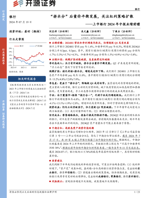【开源证券】【20240719】银行业上市银行2024年中报业绩前瞻:“挤水分”后量价平衡发展,关注红利策略扩散-23页 行业研究