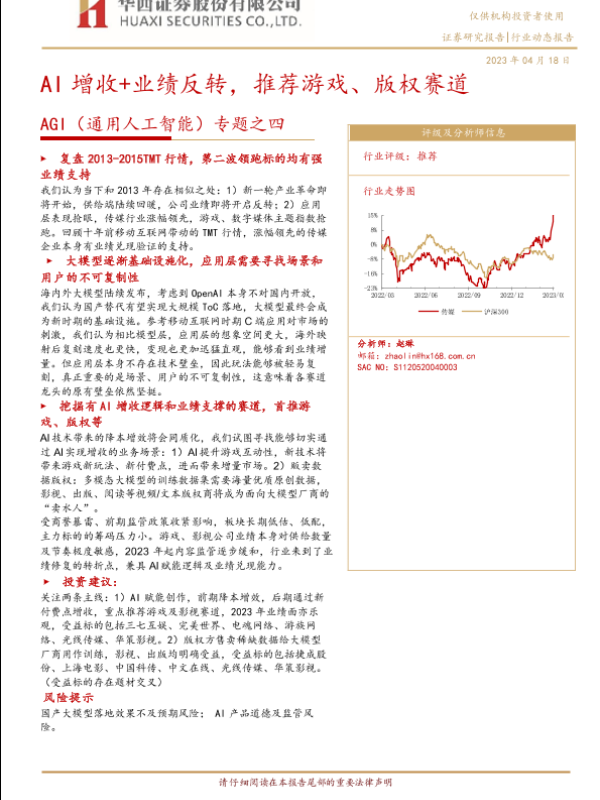 【华西证券】【20230418】传媒行业AGI(通用人工智能)专题之四:AI增收+业绩反转,推荐游戏、版权赛道-18页 行业研究
