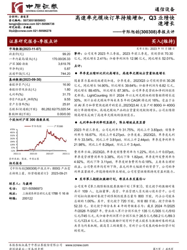 【中原证券】【20231108】高速率光模块订单持续增加_Q3业绩快速增长-5页 行业研究