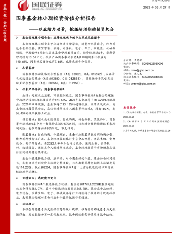 【国联证券】【20230327】国泰基金林小聪投资价值分析报告:以业绩为动量,挖掘超预期的投资机会-16页 行业研究