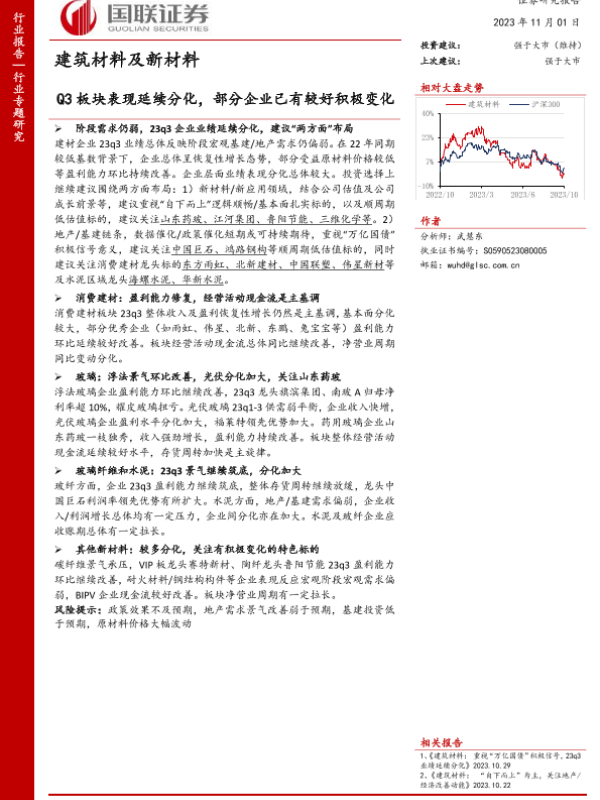 【国联证券】【20231101】建筑材料及新材料行业:Q3板块表现延续分化,部分企业已有较好积极变化-20页 行业研究