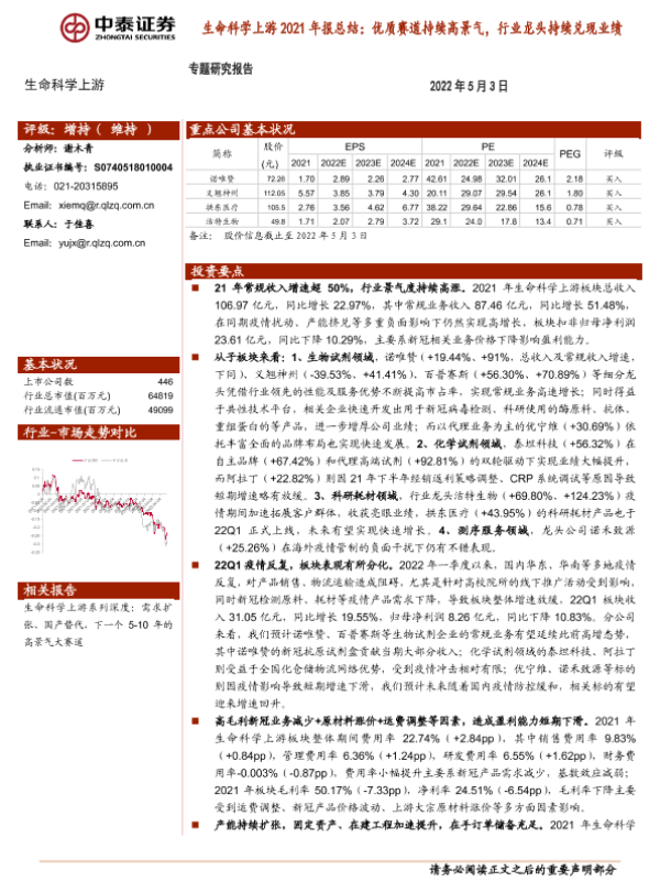 【中泰证券】【20220503】生命科学上游2021年报总结:优质赛道持续高景气,行业龙头持续兑现业绩-9页 行业研究