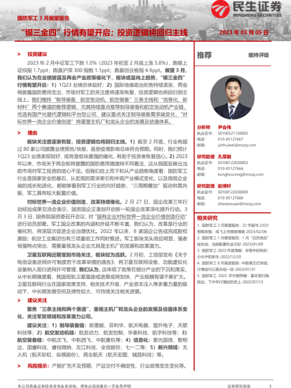 【民生证券】【20230305】国防军工3月展望报告:“银三金四”行情有望开启;投资逻辑将回归主线-16页 行业研究