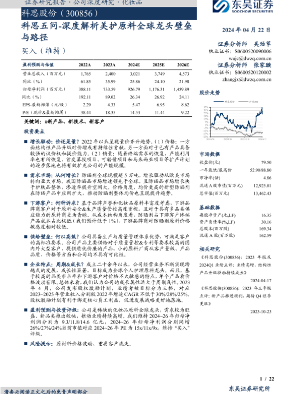 【东吴证券】【20240422】科思五问-深度解析美护原料全球龙头壁垒与路径-22页 行业研究