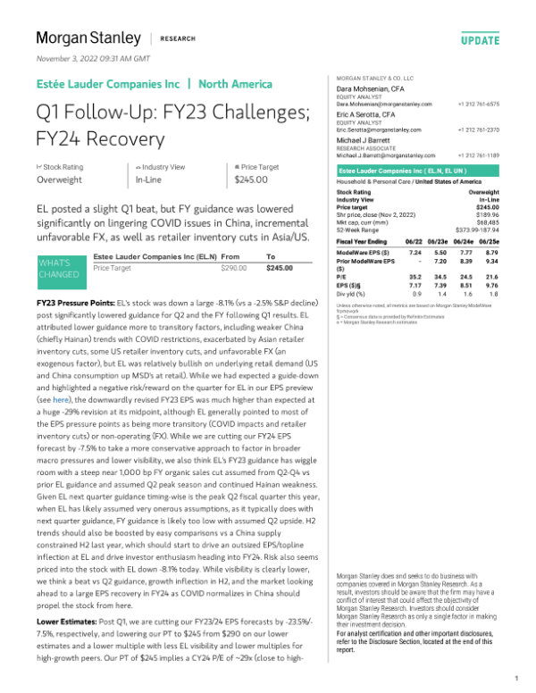 【Morgan Stanley】【20221103】Estee Lauder Companies Inc Q1 Follow-Up FY23 Challenges; FY24 Recovery-13页 行业研究
