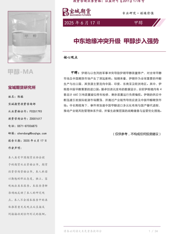 【宝城期货】【20250601】中东地缘冲突升级_甲醇步入强势-9页 证券期货研究报告